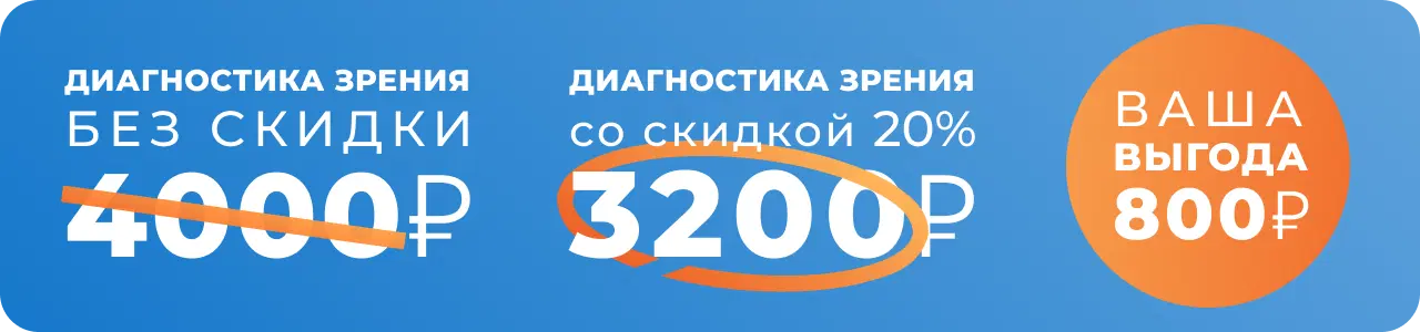 Скидка предоставляется по кодовому слову "Эксимер" на первичную диагностику. Чтобы ей воспользоваться, необходимо сообщить промокод сотруднику на ресепшене.
